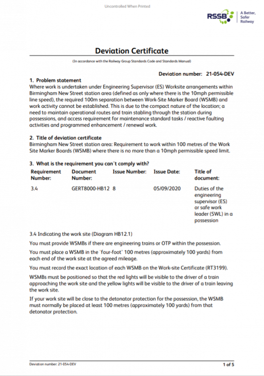 Where work is undertaken under Engineering Supervisor (ES) Worksite arrangements within Birmingham New Street station area (defined as only where there is the 10mph permissible line speed), the required 100m separation between Work-Site Marker Board (WSMB) and work activity cannot be established. This is due to the compact nature of the location; a need to maintain operational routes and train stabling through the station during possessions, and access requirement for maintenance standard tasks / reactive faulting activities and programmed enhancement / renewal work.